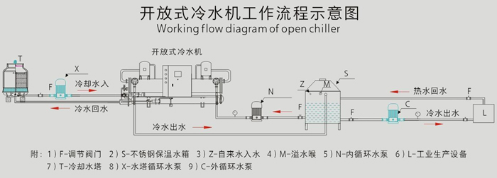 3、開放式冷水機組跟水冷式冷水機組結(jié)構運行原理一樣,開放式需要配置一臺循環(huán)儲水箱和外循環(huán)水泵;